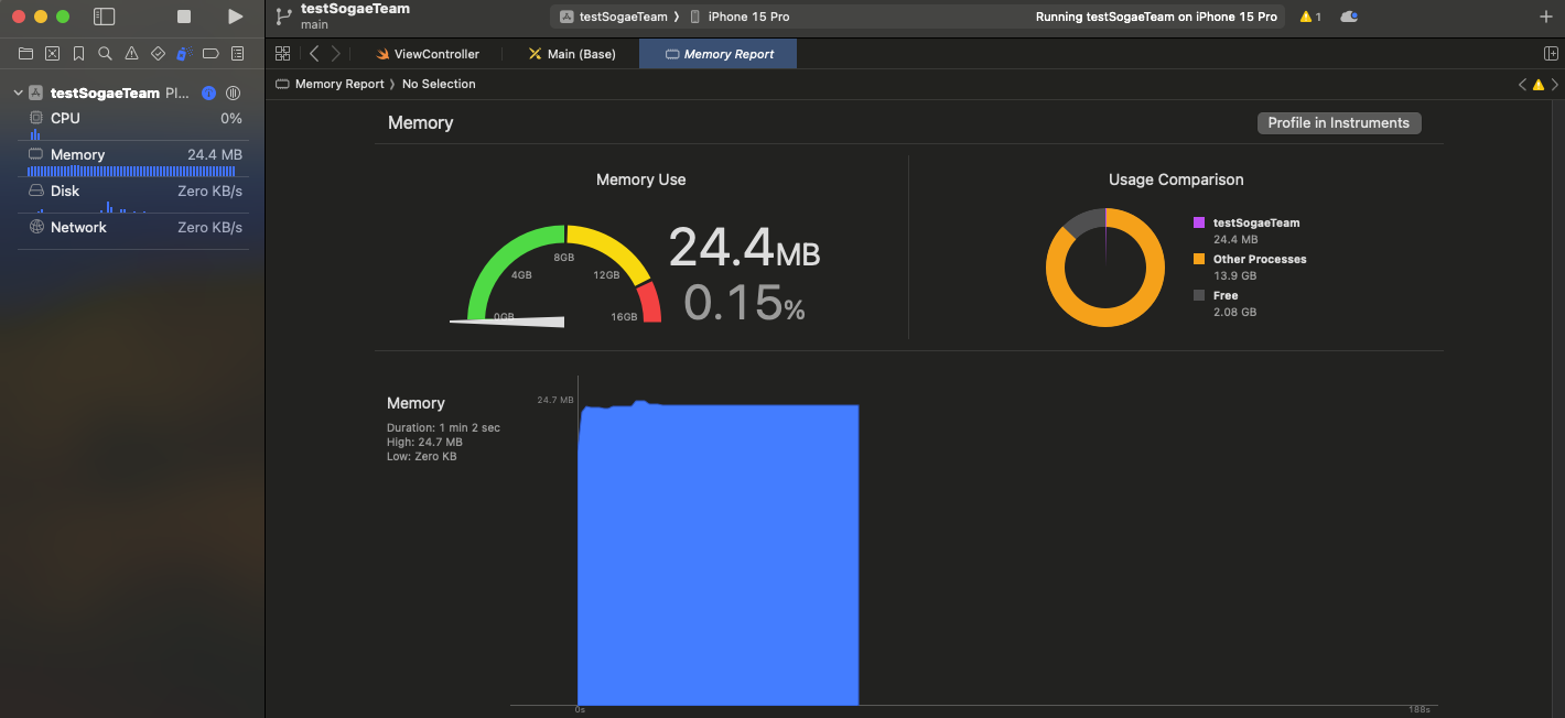 - Xcode를 통해 앱 실행 중 충돌이 일어난 경우 디버그 네이게시터 활성화(앱 실행하지 않을 때는 작동하지 않음)